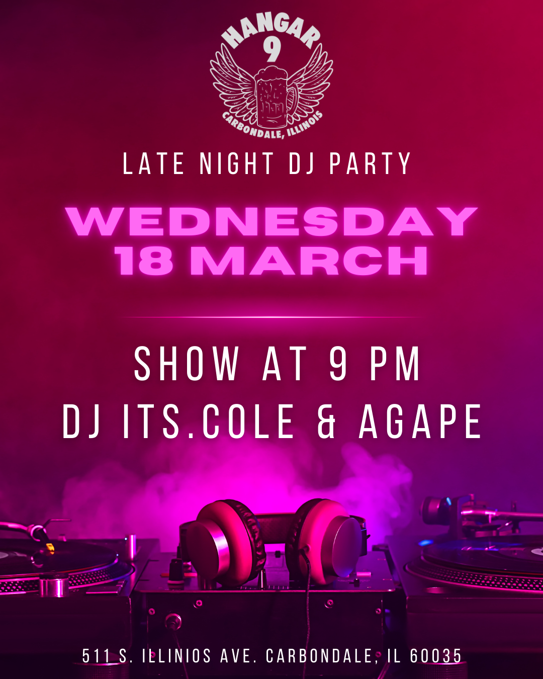 Get ready for a high-energy night on the dance floor at Hangar 9 in Carbondale. Join us Wednesday, March 18 for a Late Night DJ Party featuring DJ ITS.COLE and DJ AGAPE bringing the beats all night long.
