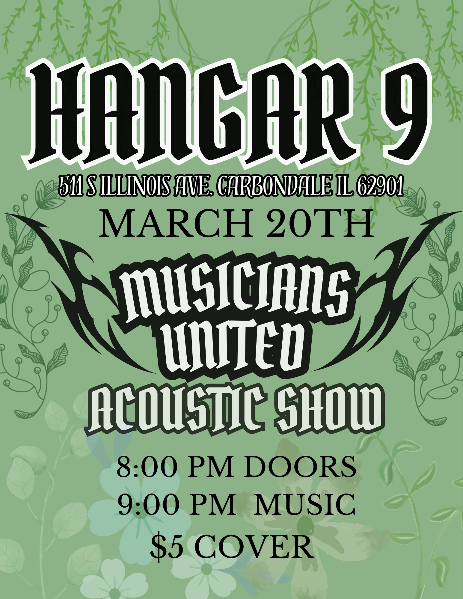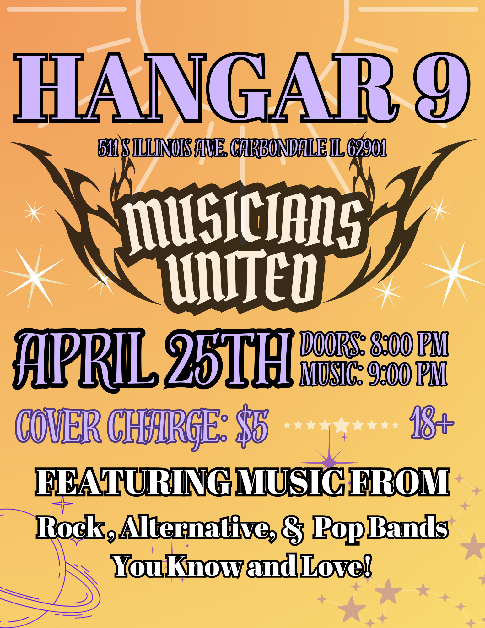 Join us at Hangar 9 for a special night of live music as Musicians United SIUC brings together a lineup of talented Southern Illinois University student performers for an intimate acoustic showcase.
