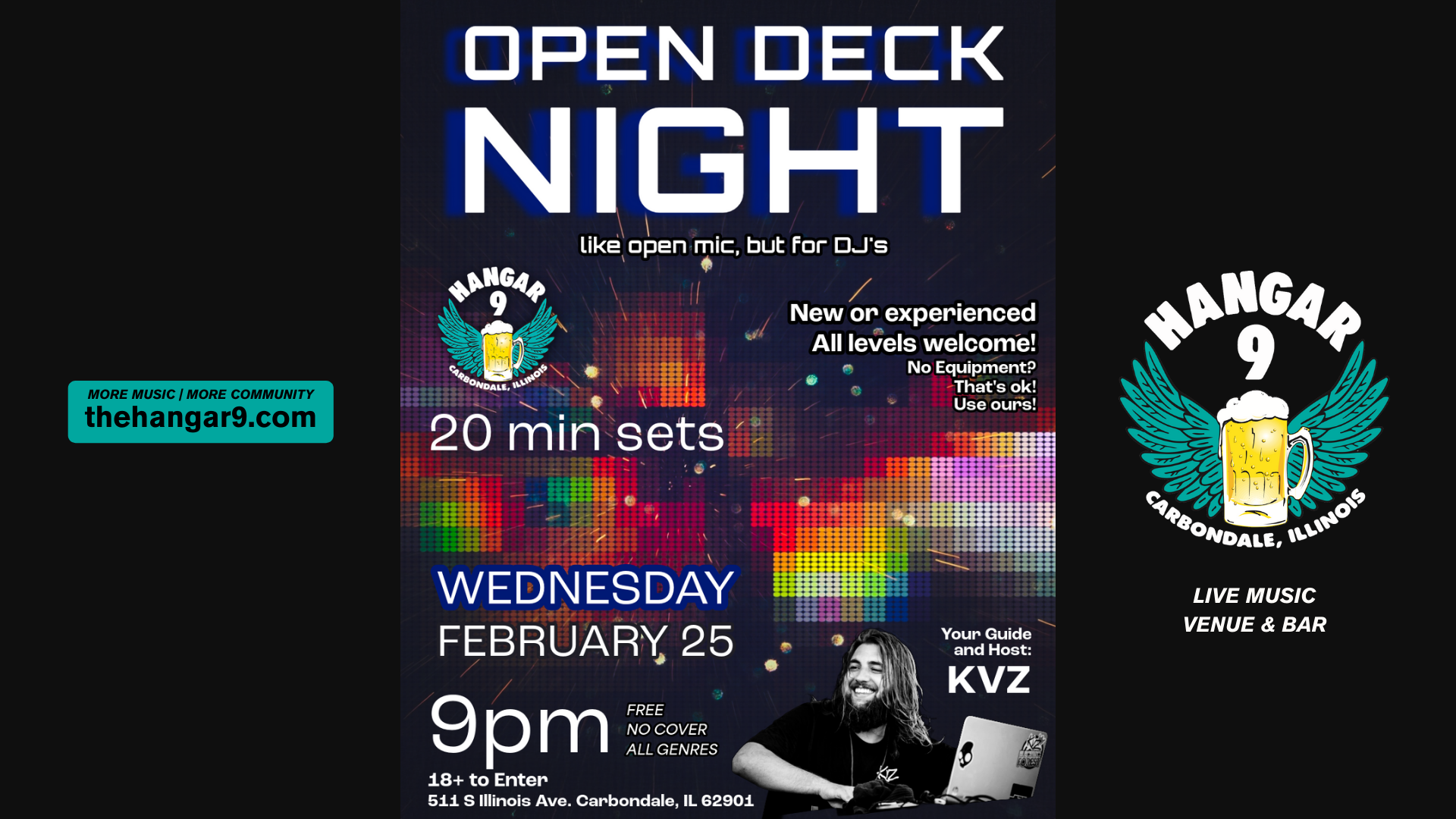 Step up to the decks or come support your local DJs at Open Deck Night at Hangar 9. This is a low-pressure, community-driven night where DJs of all styles and experience levels can play live on a real sound system.