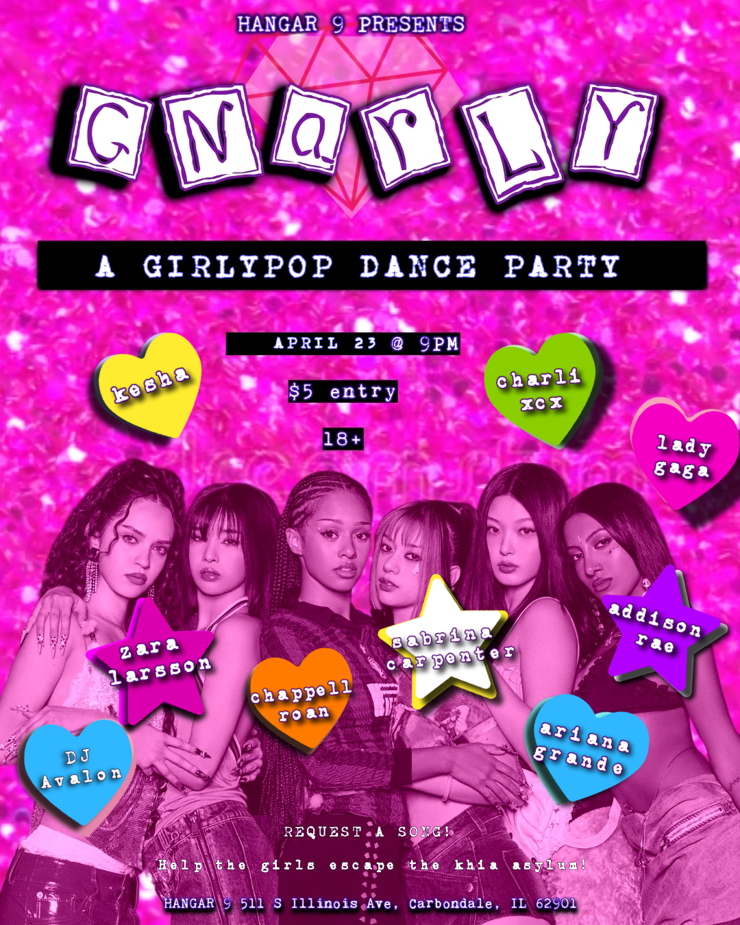 GNARLY: A GIRLYPOP DANCE PARTY $5 I 18+ Thursday, April 23, 2026 9:00 PM Friday, April 24, 2026 2:00 AM Google Calendar ICS Venue: Hangar 9 | Address: 511, S Illinois Ave, Carbondale, IL, 62901 Starts: 9pm